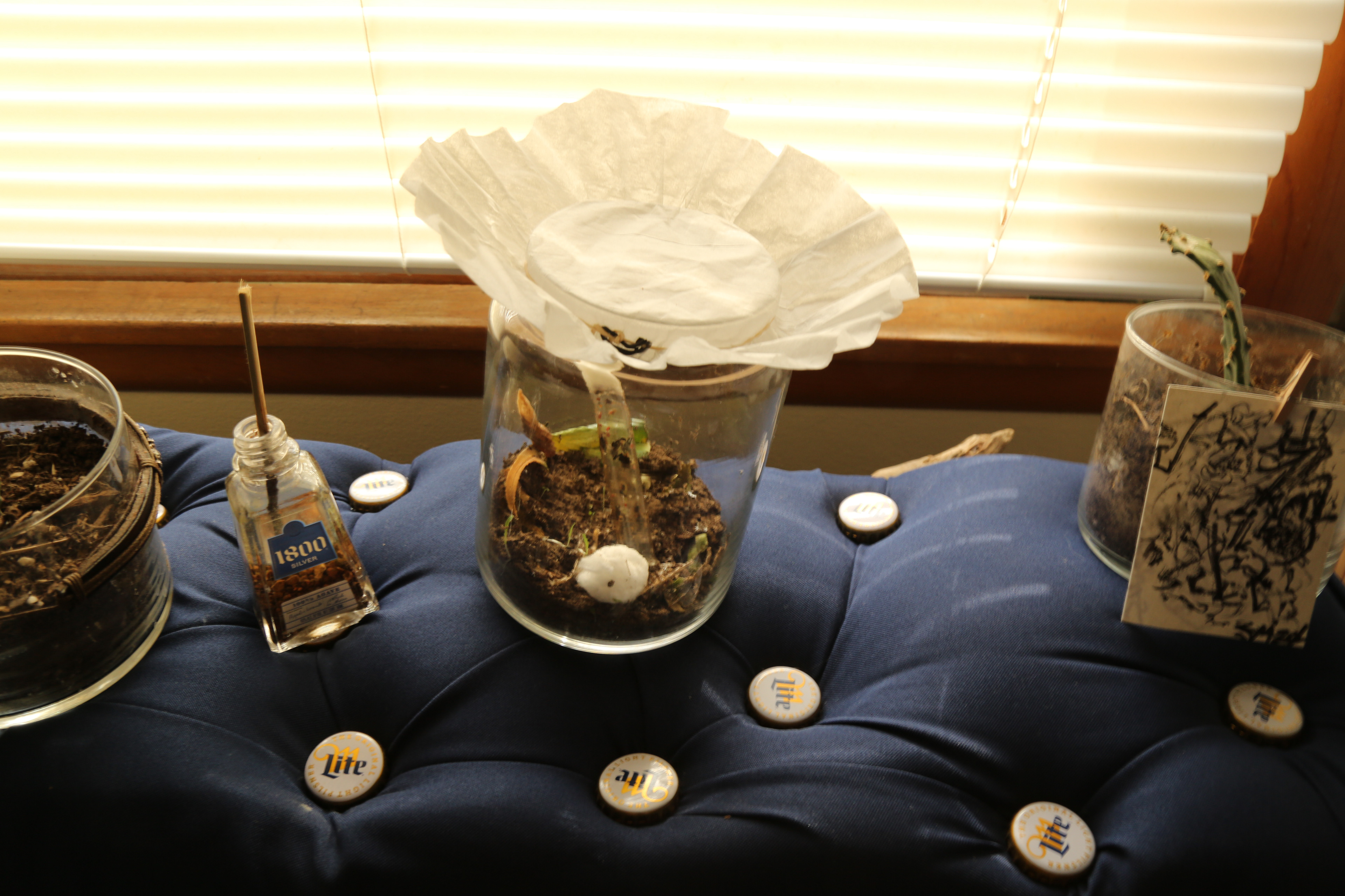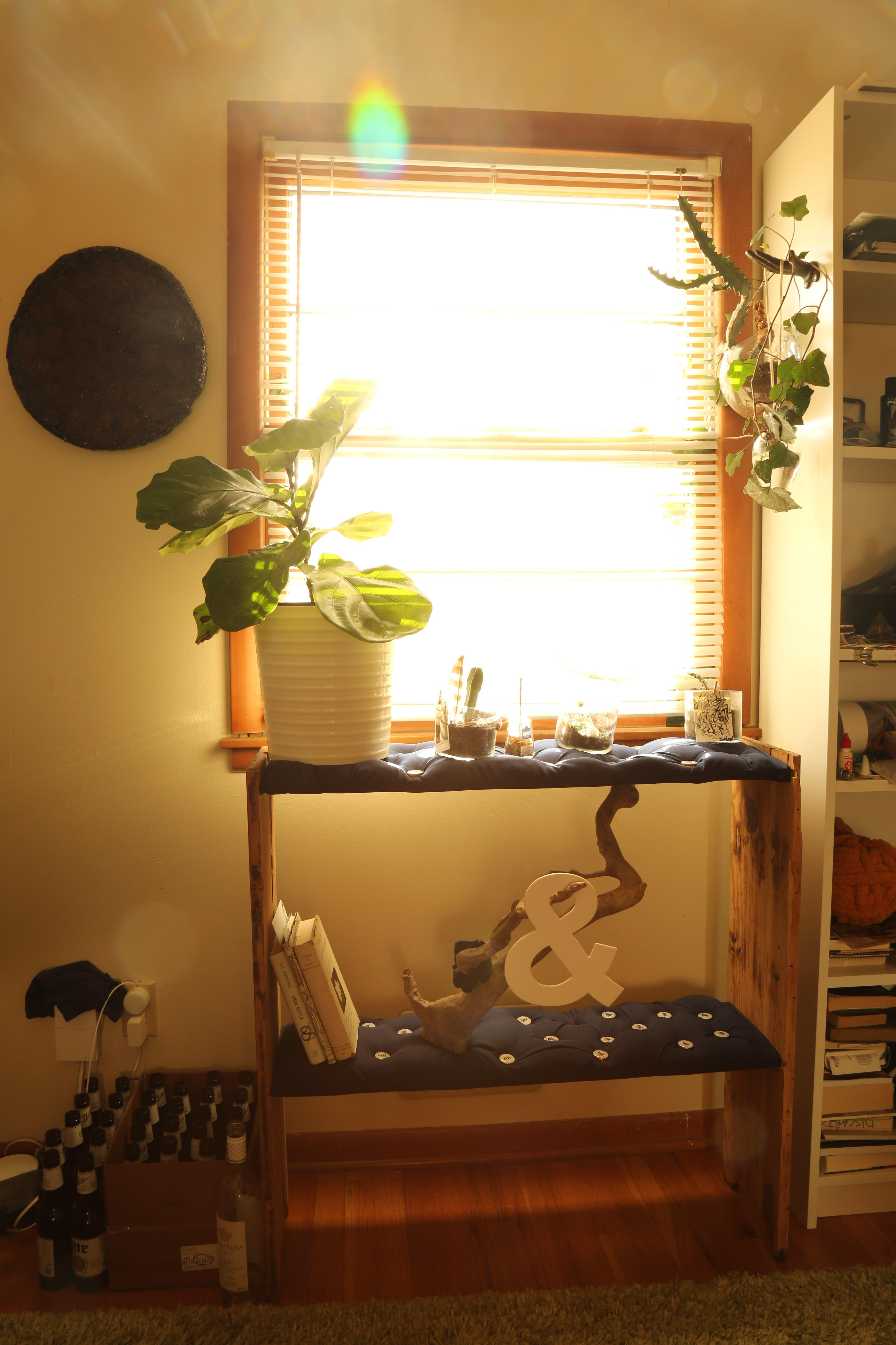 Two salvaged pieces of wood from a destroyed artifact are sanded clean of their aged stain. Initially the lumber functioned as a night stand I acquired through a romantic partner. This relationship left my life in a chaotic way as I transitioned from warehouse manufacturing to studying sculpture at the Kansas City Art Institute. The surface of these shelves serve as test pieces for following work involving tufted upholstery methods. This is the first piece I have documented in my bedroom. A personal interior, plants, and glowing blinds are meant to inspire a feeling of hope and growth despite materials of heartbreak and vice.